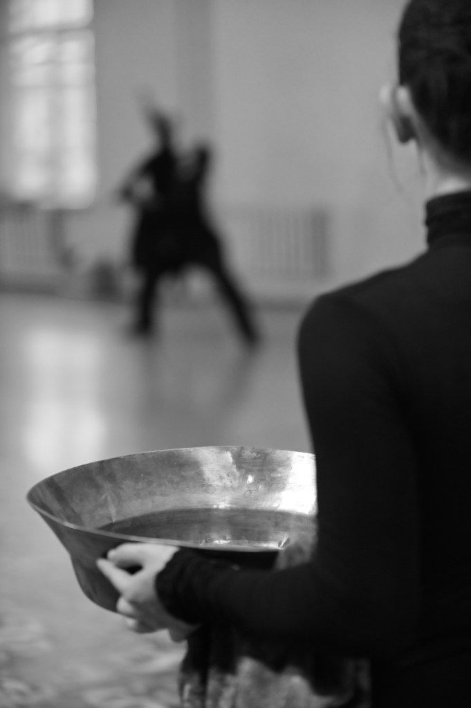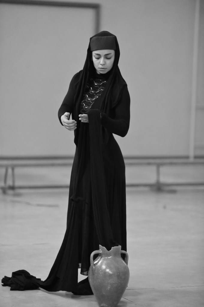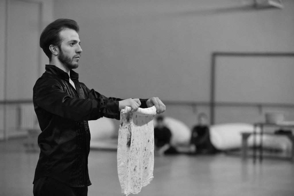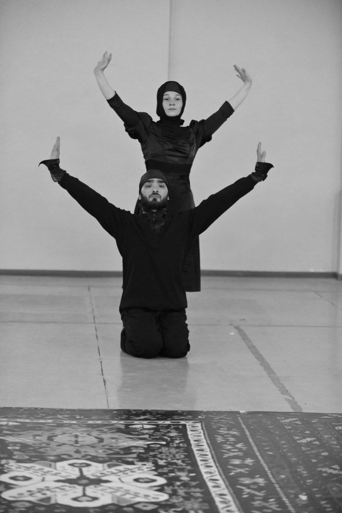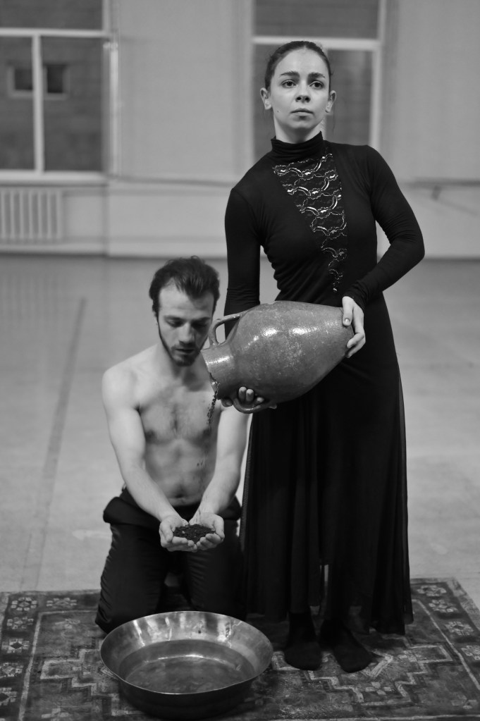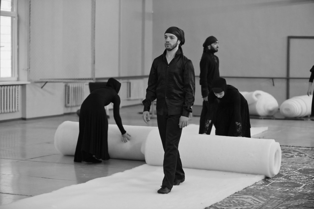 То есть это был уже совсем другой спектакль. Появилось очень много реквизита, которого не было раньше, и очень четкая стилистика. Новый спектакль черный. Даже фрукты, которые выносят на сцену, черные. Свадебное платье – черное. И ковры, которые в армянской традиции ткут из ярких нитей, черно-белые. Только в конце спектакля, в сцене смерти, появляется цвет, как символ новой жизни, и это очень важный режиссёрский ход. А в первом спектакле танцоры выходили на сцену в ярких трехах, на заднике было огромное солнце, в нем было много радости жизни. А здесь даже в веселых сценах есть привкус горечи. И это невероятно созвучно нашему времени.