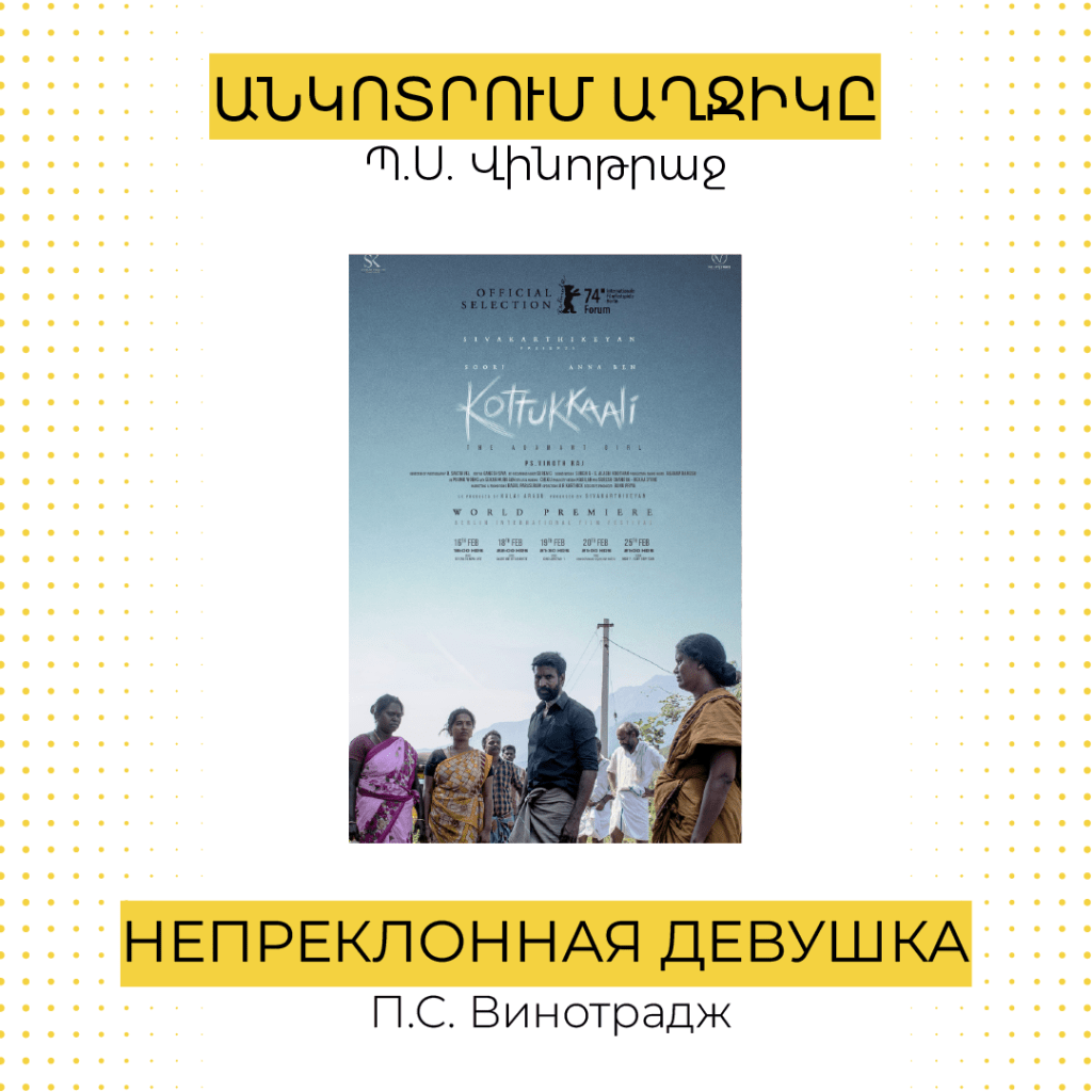 П. С. Винотрадж – молодой индийский режиссер. Хотя вернее было бы сказать – тамильский. Есть такой в Индии штат – Тамил Наду, с экстремально засушливым климатом, запредельной бедностью и отдельной независимой киноиндустрией, куда Винотрадж пришел без необходимого образования, но с нежнейшим зрительским опытом. Некоторое время он продавал DVD в городке неподалеку от родной деревни. И его дебютный фильм «Камешки» – в 2021 году он стал победителем «Золотого абрикоса» – в первую очередь поразил зрителей совершенно неожиданной чистотой и наивностью. Словно это было буквально только что родившееся кино. В нем он показал людей в их непосредственной связи с родным ландшафтом, беспощадным солнцем и раскаленной землей, по которой босые ноги героев ступали все повествование. «Непреклонная девушка», второй фильм режиссера, продолжает это гипнотическое путешествие по сельской Индии и ее чудовищным несовершенствам, только в «Камешках» главным героем и заложником ее жестокого патриархального уклада был ребенок, а здесь молодая женщина, решившаяся на невиданный бунт. Мина – так зовут героиню – не только отвергает выбранного семьей мужчину, но и влюбляется в другого, принадлежащего к низшей касте. Неспособные предположить наличие у женщины собственной воли родственники решают, что она одержима злым духом и снаряжаются в дорогу к тому, кто смог бы его изгнать. Так начинается одиссея Мины, в ходе которой автор мастерски, фактурно и в то же время не избыточно, с юмором и робкой надеждой покажет изъяны традиционной культуры, противопоставив ее жесткости, не силу, но молчаливую хрупкость героини и собственную эмпатию.