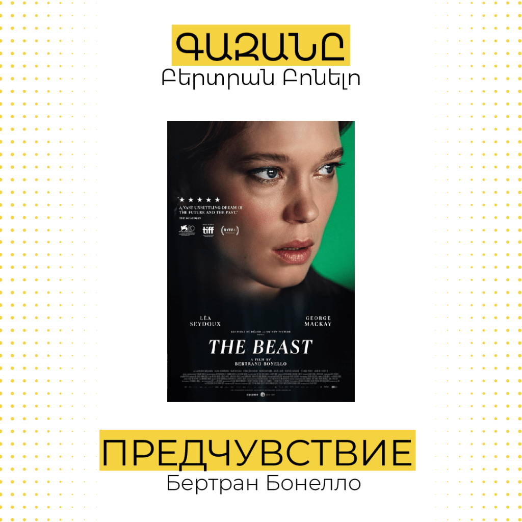 «Предчувствие» — последняя на данный момент работа одного из самых громких современных режиссеров Франции Бертрана Бонелло, автора фильмов «Кома» и «Сен-Лоран. Стиль — это я». Картина вдохновлена повестью американского классика Генри Джеймса «Зверь в чаще» (1903). Действие происходит в трех исторических эпохах: начало XX века, современность и будущее — 1910, 2014 и 2044 годы. В будущем, где вся власть принадлежит искусственному интеллекту, а людские эмоции благом не считаются, главная героиня устает от постоянного предчувствия чего-то разрушительного и решает пройти процедуру очистки ДНК от прошлых жизней. На одном из сеансов психокоррекции она знакомится с Луи. Их встреча не случайна. Они виделись и в других жизнях, и всегда между ними возникало необъяснимое притяжение. Фильм одновременно можно назвать и романтической мелодрамой, и психологическим триллером и даже научной фантастикой. В главных ролях Леа Сейду («Суперзвезда», «Жизнь Адель») и Джордж Маккей («1917»).